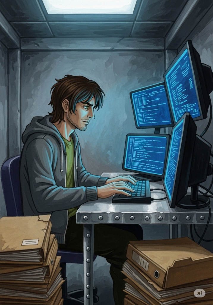Im Inneren des Bunkers roch es nach vergessenem Beton und feuchter Erde. Elian baute seinen Arbeitsplatz auf einem wackeligen Metalltisch auf. Drei Monitore erwachten zum Leben und tauchten die grauen Wände in ein unnatürliches, blaues Licht. Hier unten, tief unter den Wurzeln der Stadt, war er unsichtbar. Er war ein Geist, der bereit war, das Netz heimzusuchen.